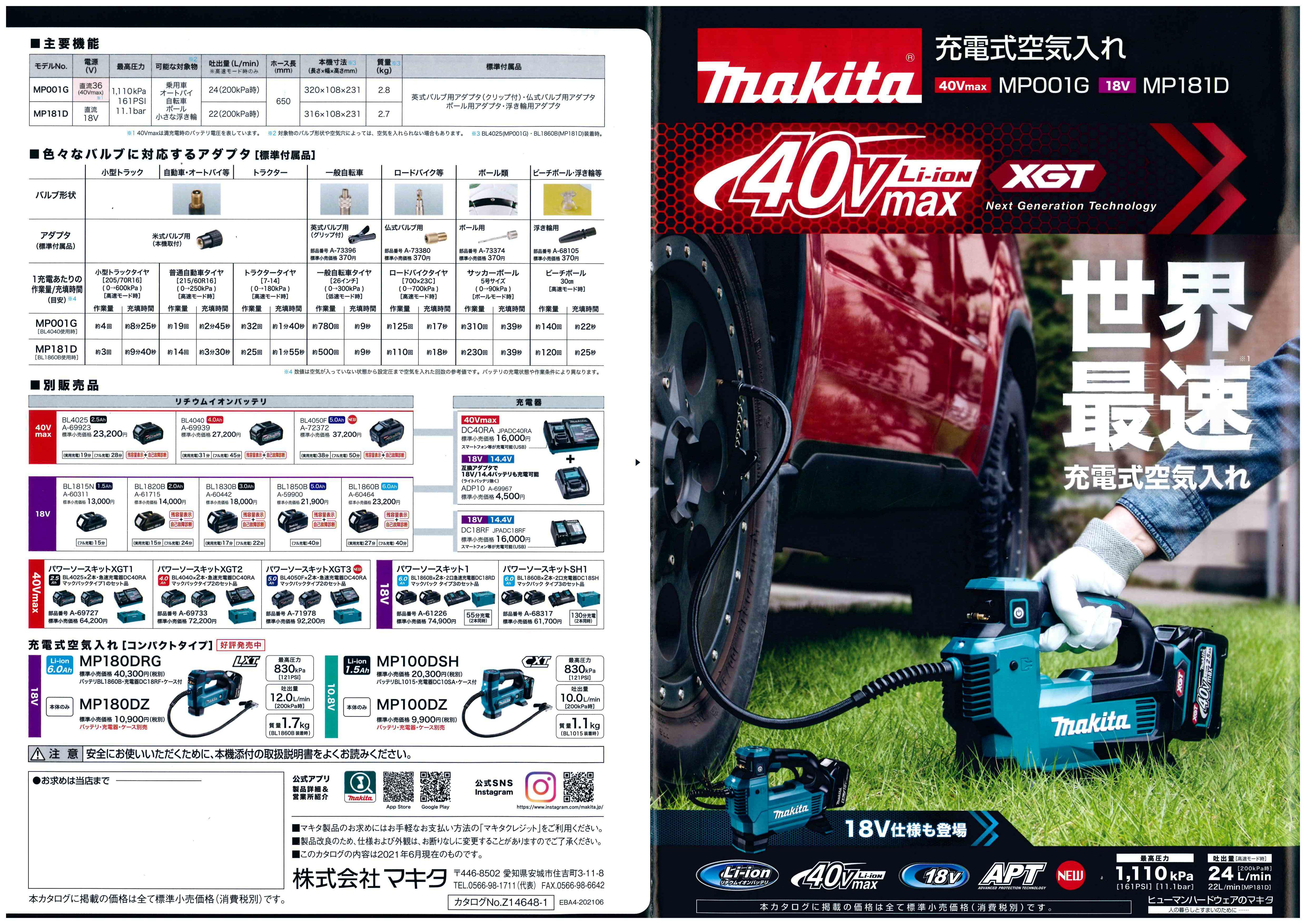 マキタ 充電式空気入れ MP001G(40V)/MP181D(18V)新発売です!