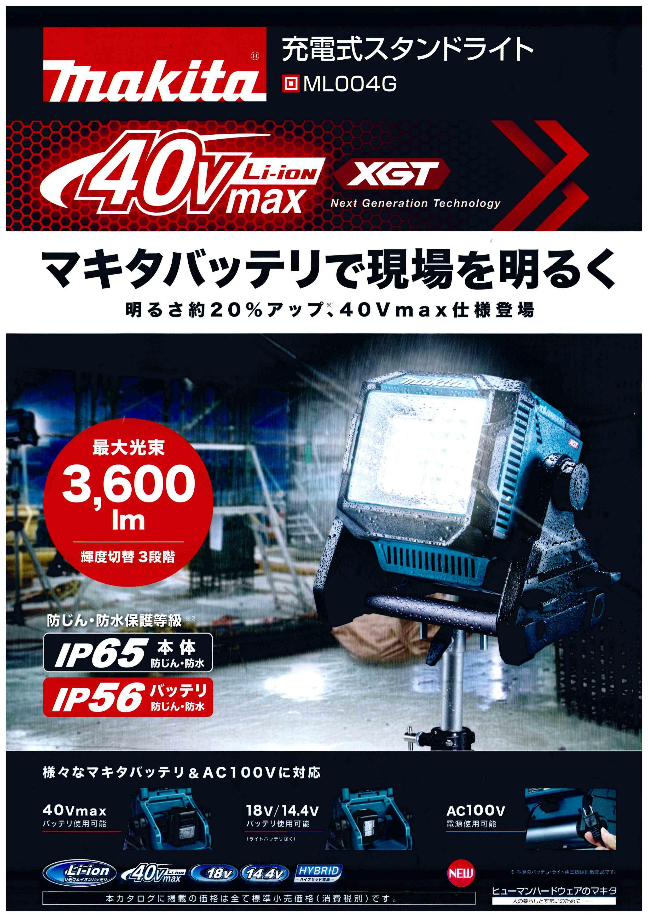 マキタ 40V/18V/14.4Vマルチ電圧対応充電式スタンドライト ML004G 新発売です!
