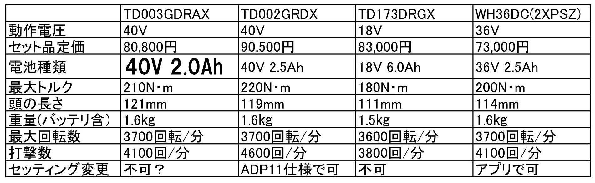 18VのTD173Dの最大トルクが180N・m、40VのTD002Gの最大トルクが220N・mと随分違うため、乗り換えた方からは強すぎるという話を聞くので、その対策として少し弱くしたのもあると思いますが、価格で随分差のついてしまったHiKOKIの対抗品というのが正直なところではないかと思いますが、それでも定価で7000円届かないというのはHiKOKIは頑張ってますね。