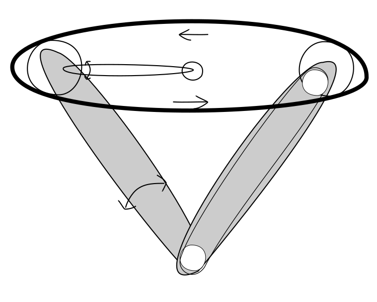 例えばこんな形、V型のアームにして、右側のアームは固定でこちら側のローラーでベルトを駆動、左側のアームははベルトのたわみに応じて閉じたり開いたり可動式にして、更に左側のアームには可動式のアームを取り付け、先端に上下のベルトの擦れ止めのローラーを取り付けます。